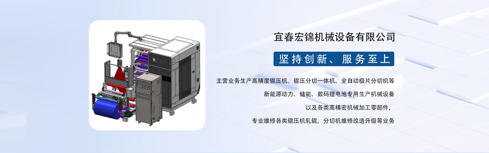 東莞市宏錦機械科技有限公司江西分公司是一家集研發(fā)、生產、銷售、服務于一體的創(chuàng)新型鋰電自動化精密機械設備專業(yè)制造、服務商,坐落于江西省新余市渝水區(qū)新余經濟開發(fā)區(qū)孵化園5號廠房,廠房面積近6000平米,由東莞市宏錦機械科技有限公司于2024年11月投資新建,交通區(qū)位優(yōu)勢明顯、產業(yè)配套便捷集中,擁有一批具有行業(yè)豐富經驗的技術人員和管理團隊。公司主營業(yè)務生產高精度輥壓機、輥壓分切一體機、全自動極片分切機等新能源動力、儲能、數碼鋰電池專用生產機械設備以及各類高精密機械加工零部件,專業(yè)維修各類輥壓機軋輥,分切機維修改造升級等業(yè)務。根據公司發(fā)展三步走戰(zhàn)略規(guī)劃經營現下設三個二級獨立運營事業(yè)部分別為分切事業(yè)部(分切機、輥壓分切一體機)、磨輥事業(yè)部(輥壓機、軋輥修磨)、機加事業(yè)部(精密機械部件加工)。經過十余年沉淀發(fā)展主要客戶有新余贛鋒、南昌維科、宜春清陶、云南路華、河南恒一、江西程疆、四川天萊、蕪湖天弋、惠州億緯鋰能、無錫盤古新能源、鄭州比克、安徽鋰天下、臺灣長利(宏基集團)、重慶維都利(紫建電子)、贛州諾威、安徽利維能、漳州萬寶、重慶佳寶成、廣西皇冠儲能等一批具有行業(yè)知名度和影響力的企業(yè)。公司在新能源發(fā)展的道路上堅持創(chuàng)新,為客戶帶來穩(wěn)定、高效的自動化專用設備和更大的收益。